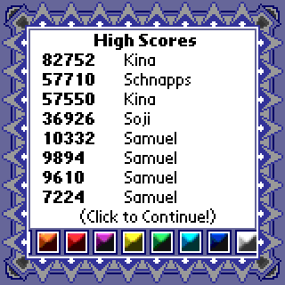 Any tiles left over are called "orphan tiles." If you have fewer than 6 orphans, you will proceed on to the next level of play. You can see the number of orphan tiles during play by looking at the lower left of the screen, under the terminal line. When the stack of orphans passes the line, the game is over.